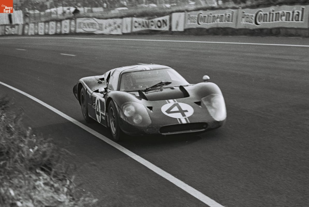 Fresh from its 1-2-3 podium sweep with the GT40 Mark II in 1966, Ford Motor Company entered four of its new Mark IV cars in the 24 Hours of Le Mans for 1967. Denny Hulme and Lloyd Ruby co-piloted the #4 car. Their race ended around 9:15 p.m. when an oily patch on the track sent Ruby sliding into an embankment.