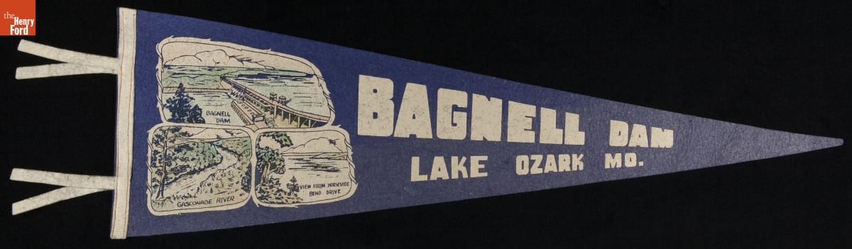 Tourists purchase simple, inexpensive souvenirs as proof of their travels. These mementos transport vacationers back to the places they visited and the things they did. In the mid-20th century, felt pennants were trendy. This pennant depicts scenic views visitors may have seen on their trip to Bagnell Dam in the Missouri Ozarks.