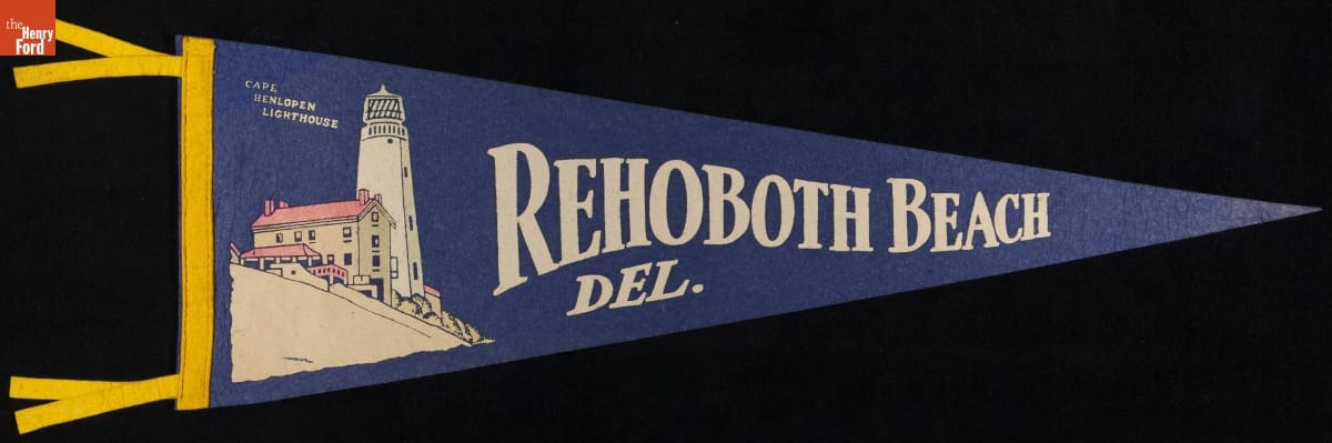 Tourists purchase simple, inexpensive souvenirs as proof of their travels. These mementos transport vacationers back to the places they visited and the things they did. This pennant depicts the lighthouse once located near Rehoboth Beach, Delaware. The lighthouse collapsed in 1926, but remained an iconic symbol for the popular seaside destination long after its demise.