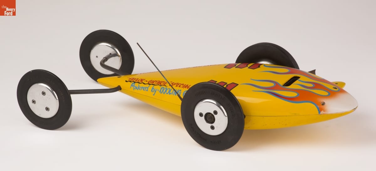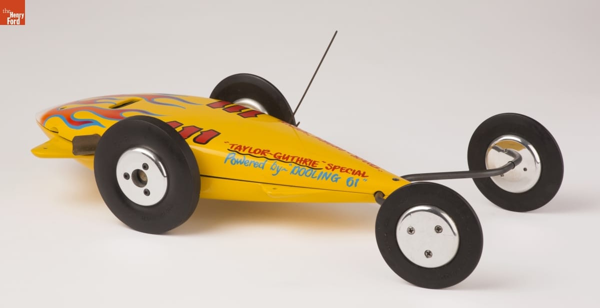 Tether cars, gas-powered model race cars, were popular in the 1930s and 1940s. They were raced individually while tethered to a central pivot, or against each other on a scaled-down board track. This streamlined model was built by E.L. Taylor and Ray Guthrie of Spokane, Washington, in 1949. Taylor and Guthrie produced about ten tether car models during their collaboration.