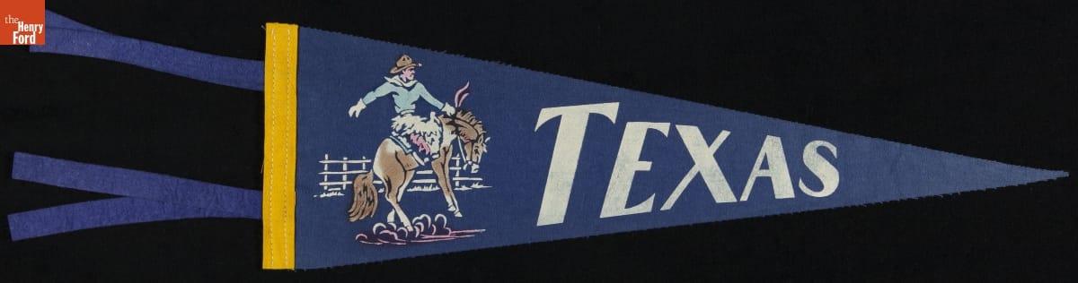 Tourists purchase simple, inexpensive souvenirs as proof of their travels. These mementos transport vacationers back to the places they visited and the things they did. In the mid-20th century, felt pennants were trendy. Many pennants include a representative image that define a city, state or region. This pennant features an image of a cowboy on a bucking bronco to remind vacationers of Texas's western heritage.