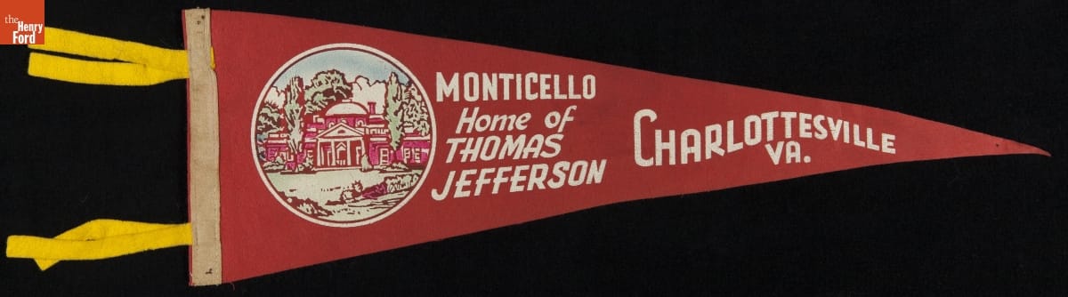 After World War II, highways were flooded with family vacationers out to enjoy their new cars and all that America had to offer. Some families wanted to view the country's scenic beauty; others headed for places of historic importance such as Thomas Jefferson's Monticello. Souvenirs like this pennant helped vacationers remember their visit to Jefferson's Virginia home.