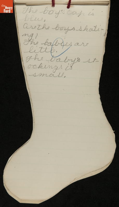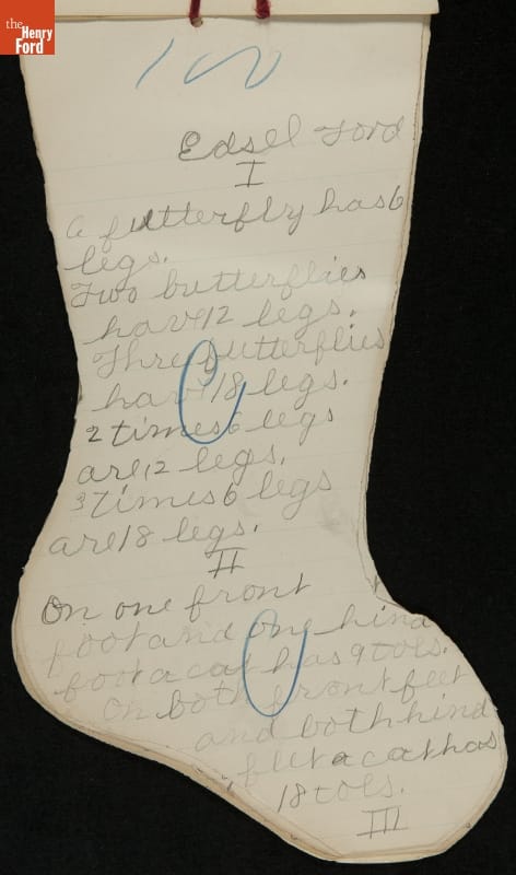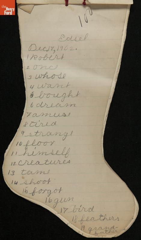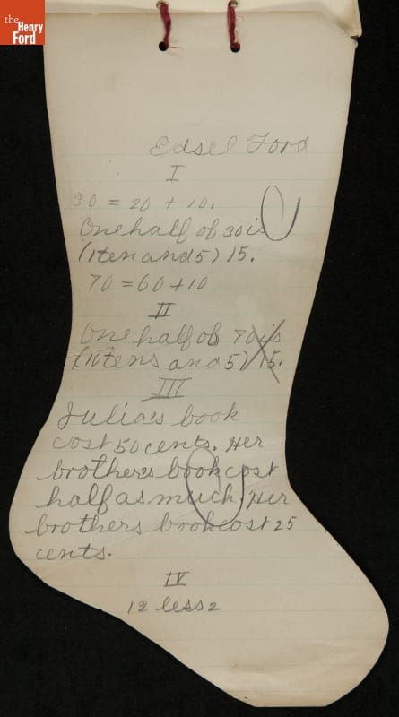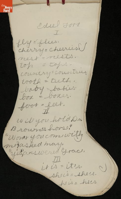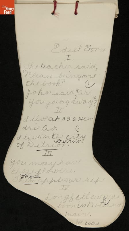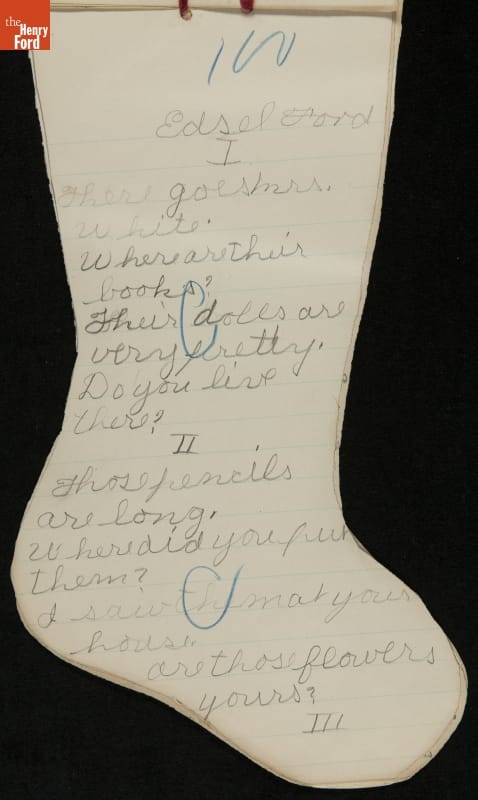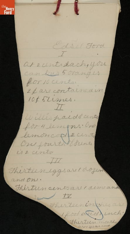 Edsel Ford, the only child of Henry and Clara Ford, attended the Farrand elementary school in Detroit, Michigan. Clara took an active interest in young Edsel's schooling and made sure he completed his homework on time. In December 1902, Edsel used this Christmas stocking-shaped assignment book for schoolwork. Like many doting parents, Henry and Clara saved these small bits of their child's accomplishments.