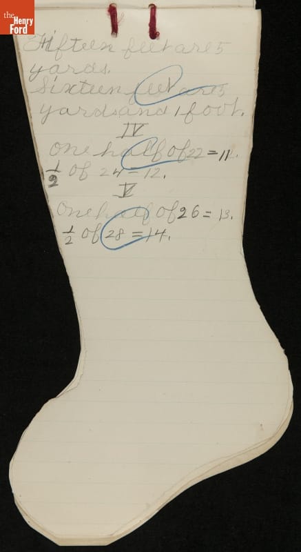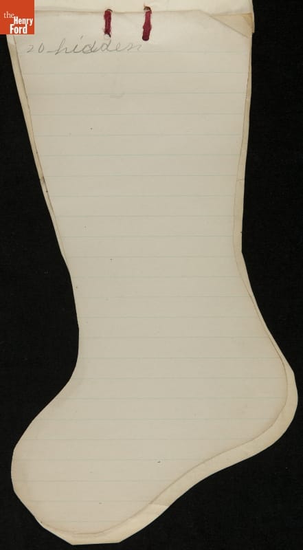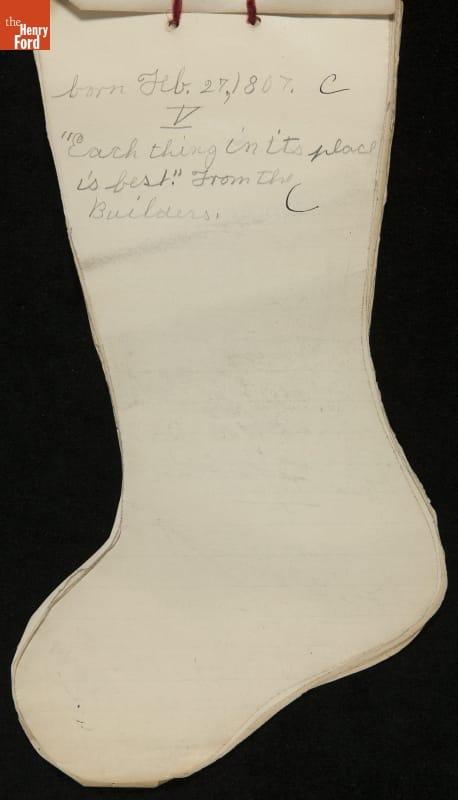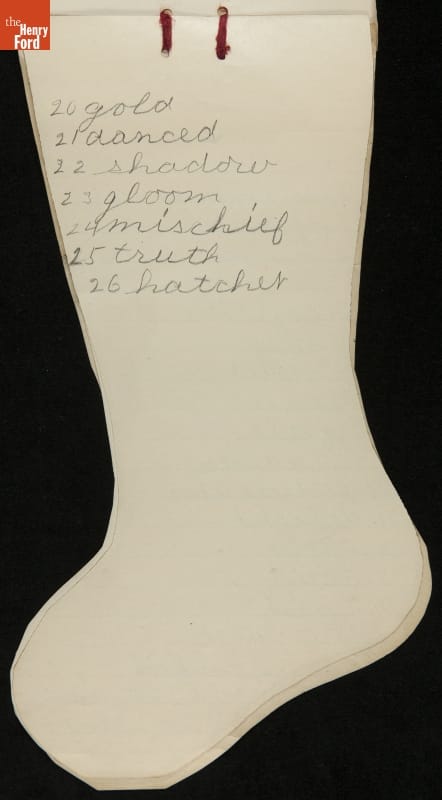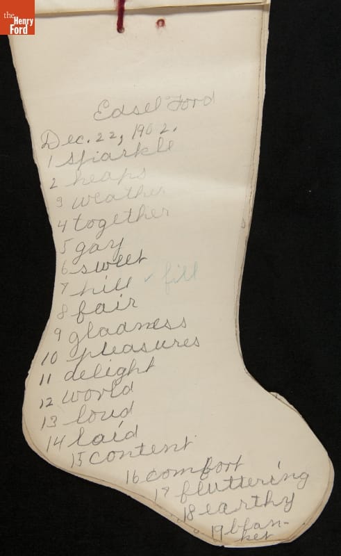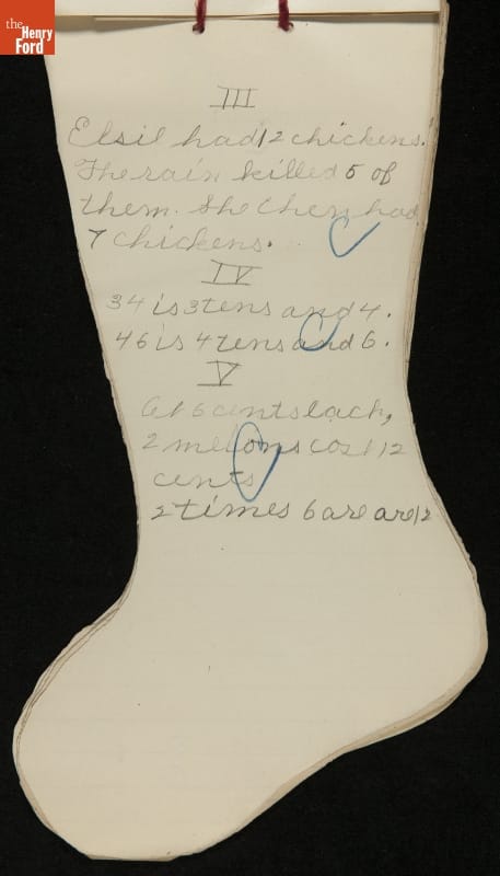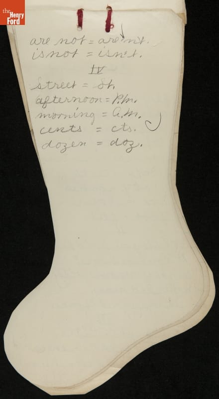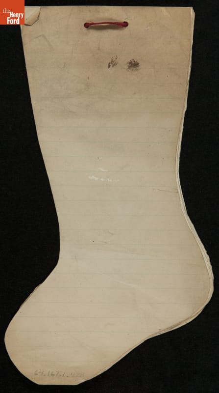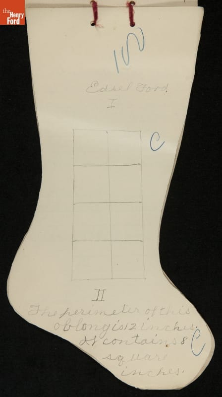 Edsel Ford, the only child of Henry and Clara Ford, attended the Farrand elementary school in Detroit, Michigan. Clara took an active interest in young Edsel's schooling and made sure he completed his homework on time. In December 1902, Edsel used this Christmas stocking-shaped assignment book for schoolwork. Like many doting parents, Henry and Clara saved these small bits of their child's accomplishments.