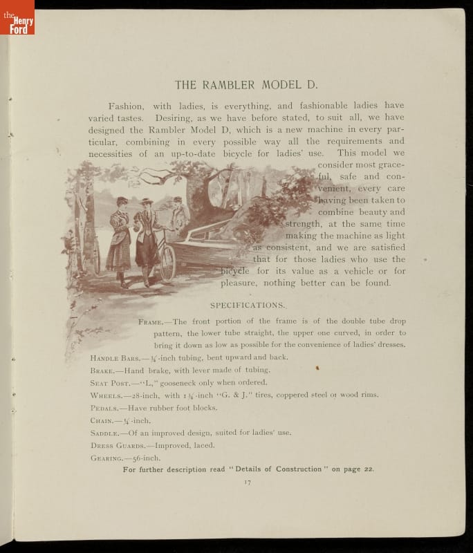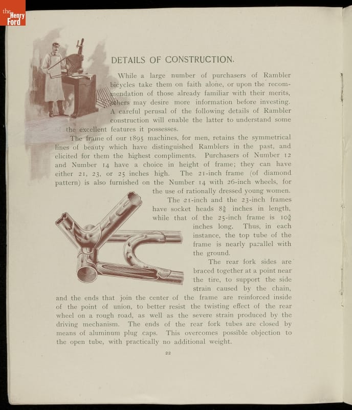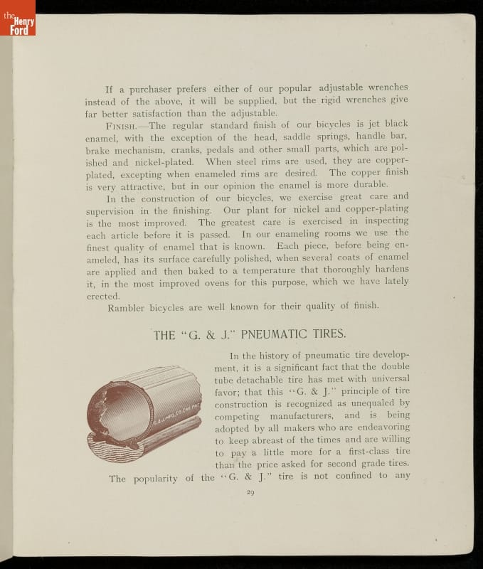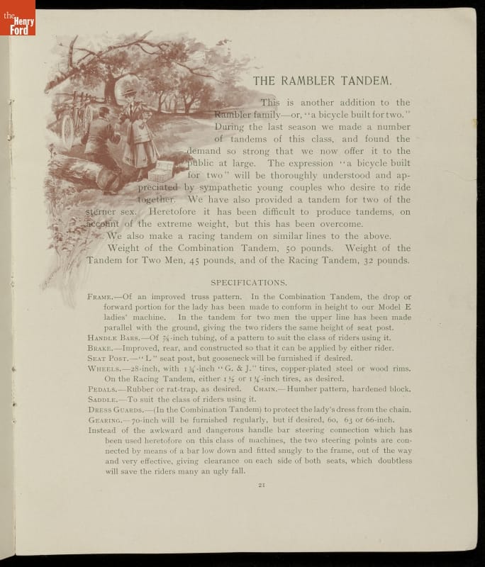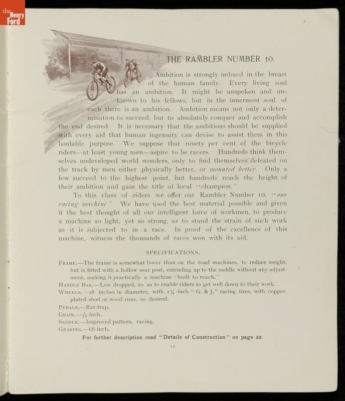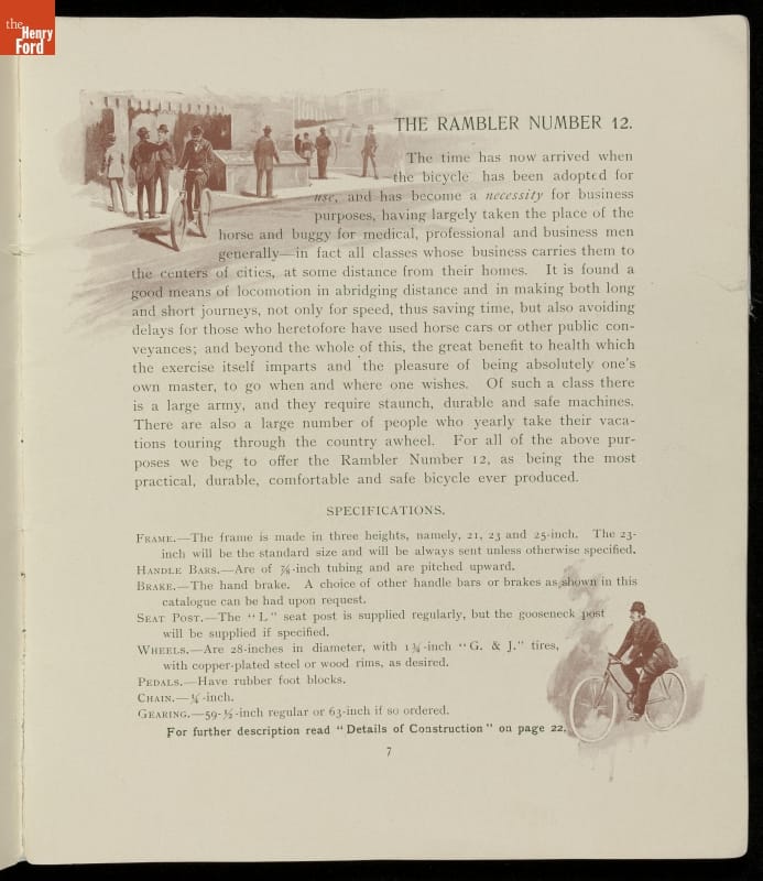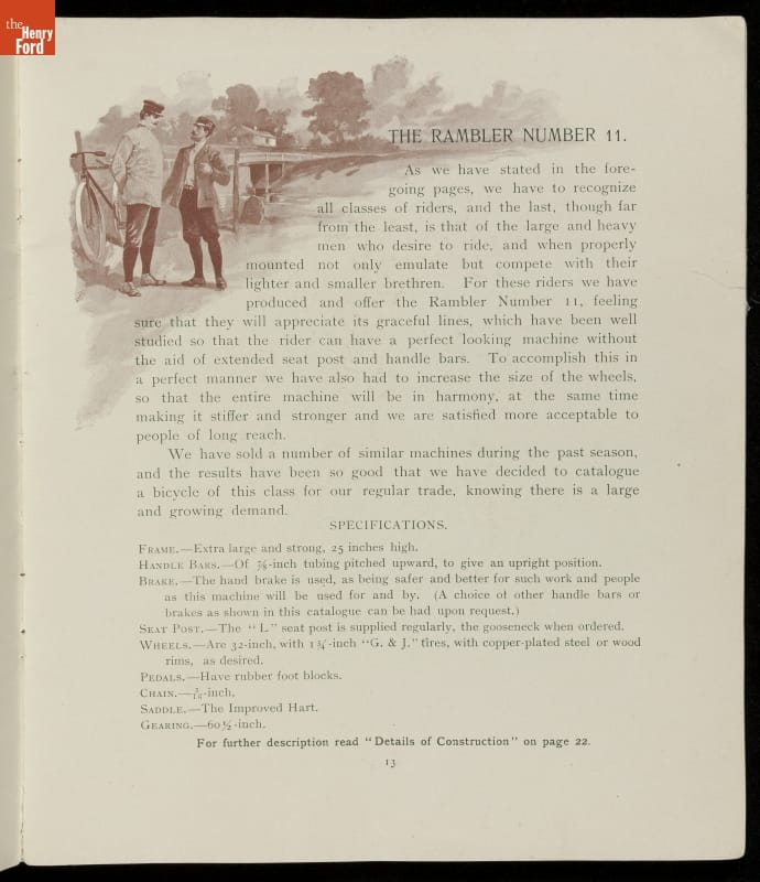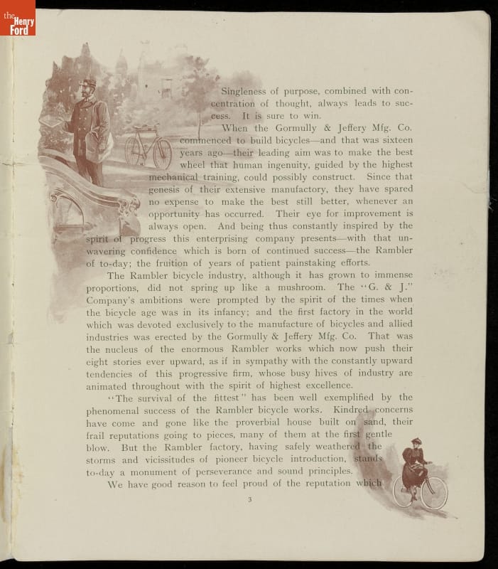 Gormully and Jeffery, maker of the Rambler bicycle, published this catalog in 1895. The pages contain specifications and images for a number of bicycles, and sections on the details of construction. Like most catalogs, the company praised its machines and quality manufacturing above all others.