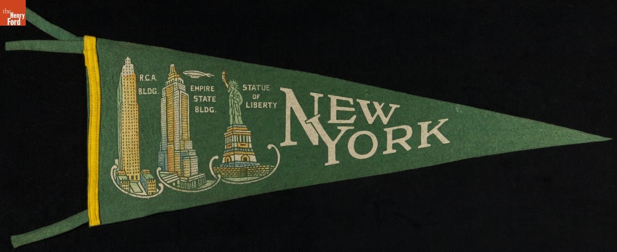 Tourists purchase simple, inexpensive souvenirs as proof of their travels. These mementos transport vacationers back to the places they visited and the things they did. In the mid-20th century, felt pennants were trendy. Pennants from large cities usually depict a single famous, not-to-be-missed landmark -- but not New York. This colorful pennant from the 1930s shows three.
