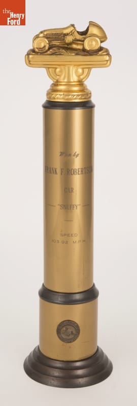 Tether cars, gas-powered model race cars, were popular in the 1930s and 1940s. They were raced individually while tethered to a central pivot, or against each other on a scaled-down board track. Model builder and racer Frank Robertson won several trophies from the American Miniature Racing Car Association with a series of tether cars he named "Snuffy."