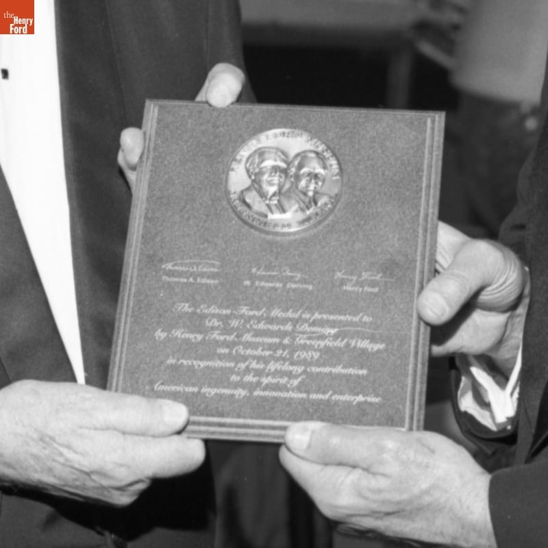In 1989, management specialist W. Edwards Deming (left) received the first-ever Edison-Ford Medal in recognition of his lifelong contribution to the spirit of American ingenuity, innovation and enterprise. Deming pioneered the quality-control movement, particularly in Japan where he advised industrialists rebuilding after World War II. Deming also shared his teachings with American manufacturers like Ford Motor Company.