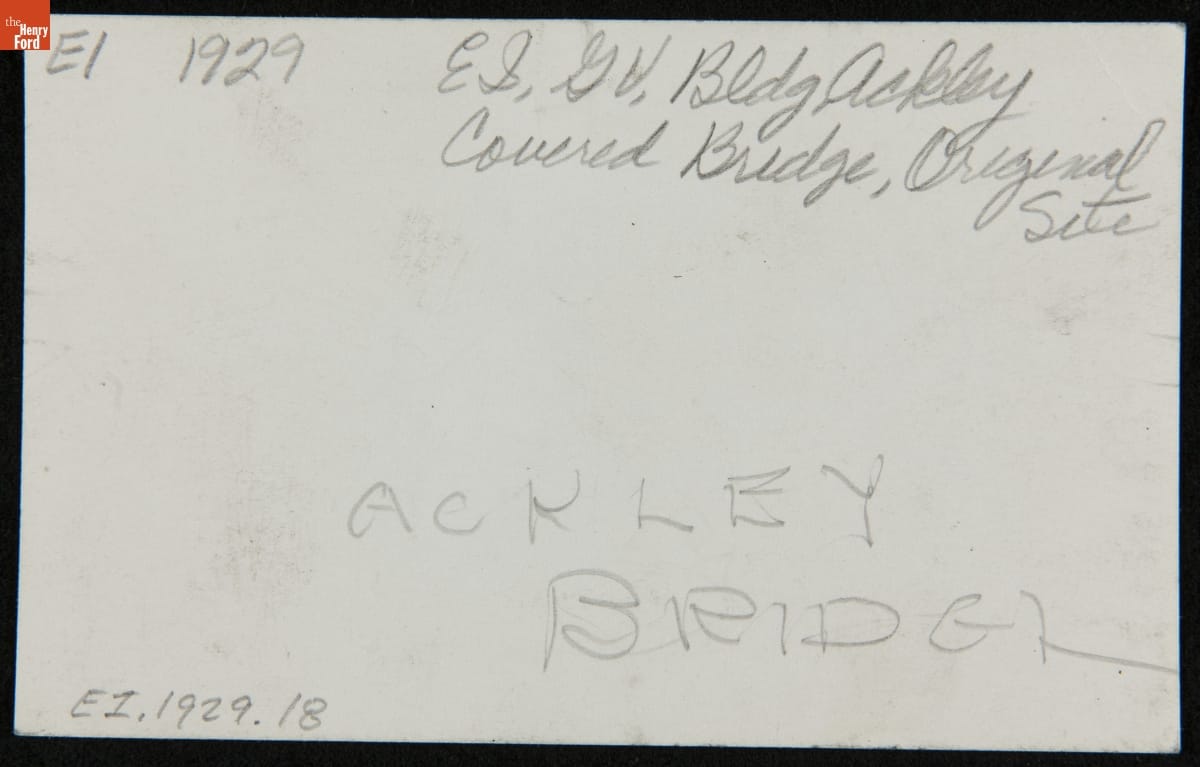 The Ackley Covered Bridge, built in 1832 on land owned by Joshua Ackley, spanned a branch of Wheeling Creek in southwestern Pennsylvania. By the mid 1930s the wooden bridge had outlived its usefulness and was slated for demolition. Descendants of the Ackley family purchased the bridge and offered it to Henry Ford. Ford sent his employees to document the structure before its relocation to Greenfield Village.