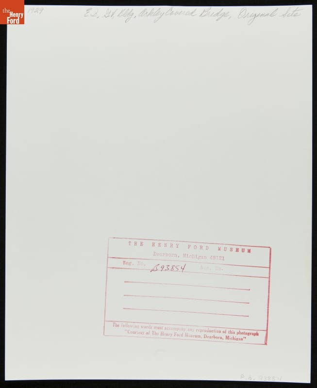 The Ackley Covered Bridge, built in 1832 on land owned by Joshua Ackley, spanned a branch of Wheeling Creek in southwestern Pennsylvania. By the mid 1930s the wooden bridge had outlived its usefulness and was slated for demolition. Descendants of the Ackley family purchased the bridge and offered it to Henry Ford. Ford sent his employees to document the structure before its relocation to Greenfield Village.