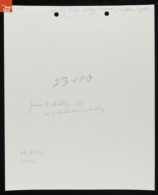 The Ackley Covered Bridge, built in 1832 on land owned by Joshua Ackley, spanned a branch of Wheeling Creek in southwestern Pennsylvania. By the mid-1930s the wooden bridge had outlived its usefulness. Elizabeth Evans, granddaughter of Joshua Ackley, purchased the bridge and offered it to Henry Ford for his Greenfield Village. She also helped document the Ackley family by providing photographs of Joshua and his descendants.