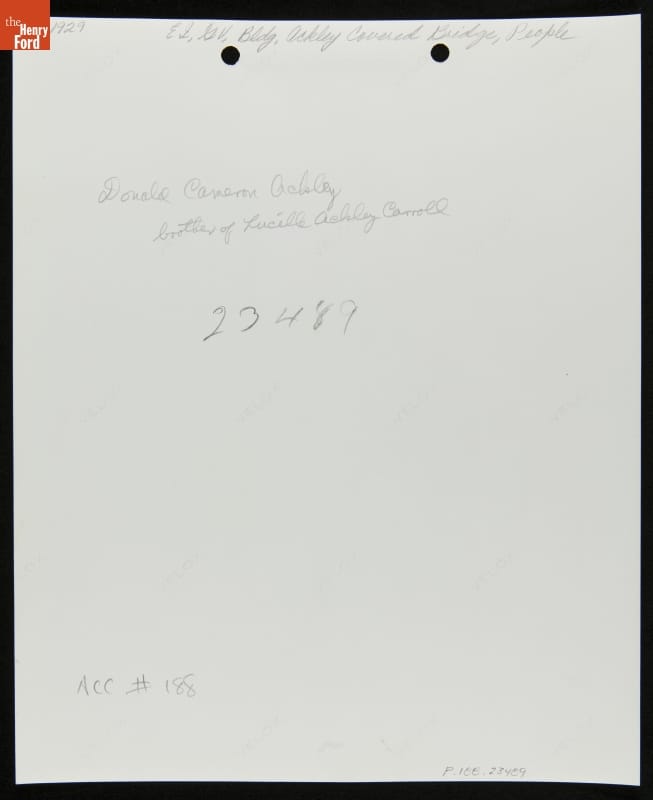 The Ackley Covered Bridge, built in 1832 on land owned by Joshua Ackley, spanned a branch of Wheeling Creek in southwestern Pennsylvania. By the mid-1930s the wooden bridge had outlived its usefulness. Elizabeth Evans, granddaughter of Joshua Ackley, purchased the bridge and offered it to Henry Ford for his Greenfield Village. She also helped document the Ackley family by providing photographs of Joshua and his descendants.