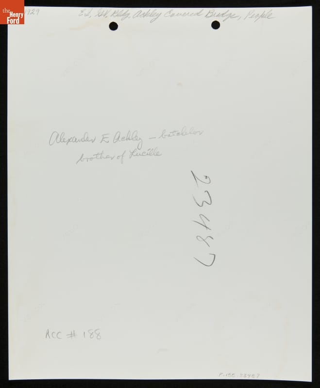 The Ackley Covered Bridge, built in 1832 on land owned by Joshua Ackley, spanned a branch of Wheeling Creek in southwestern Pennsylvania. By the mid-1930s the wooden bridge had outlived its usefulness. Elizabeth Evans, granddaughter of Joshua Ackley, purchased the bridge and offered it to Henry Ford for his Greenfield Village. She also helped document the Ackley family by providing photographs of Joshua and his descendants.