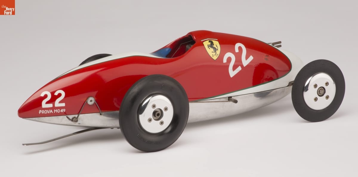 Tether cars, gas-powered model race cars, were popular in the 1930s and 1940s. They were raced individually while tethered to a central pivot, or against each other on a scaled-down board track. This ILG model is painted in the colors of Italian racing team and sports car maker Ferrari. It features an aluminum body pan and a carved wood top.