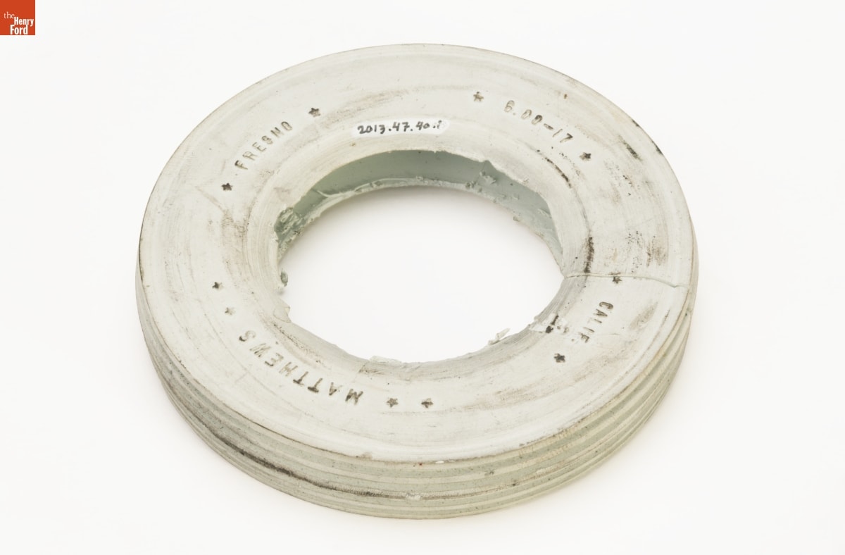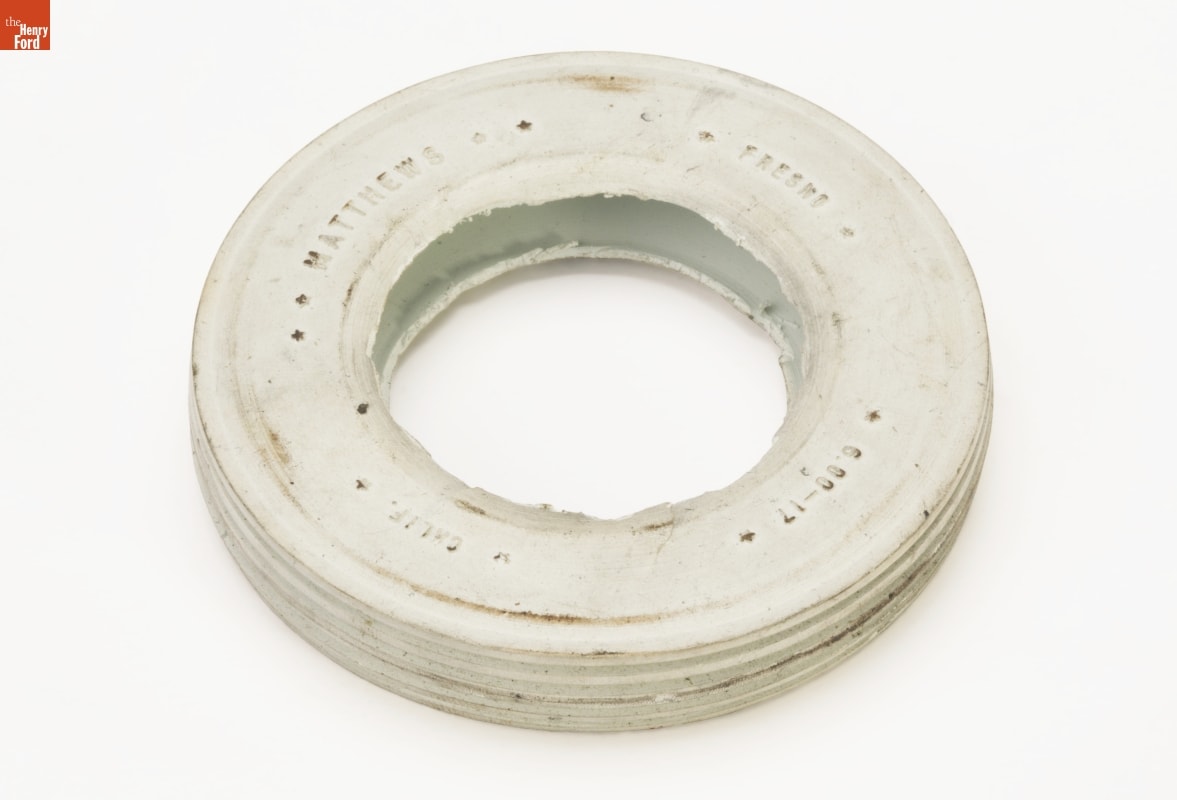 Tether cars, gas-powered model race cars, were popular in the 1930s and 1940s. They were raced individually while tethered to a central pivot, or against each other on a scaled-down board track. This rubber tire was produced by the Matthews Foundry of Fresno, California. Matthews tether cars were successful in sales and on race tracks.