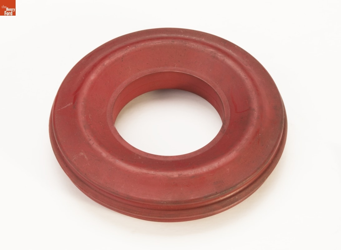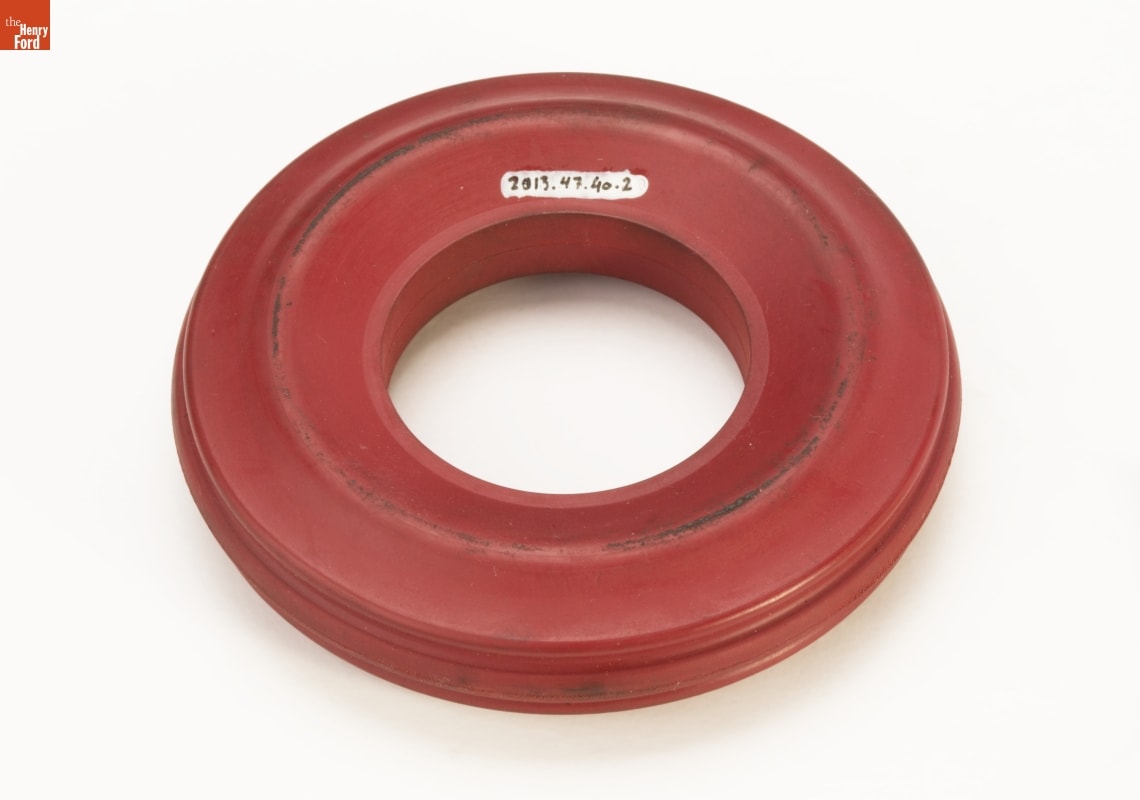 Tether cars, gas-powered model race cars, were popular in the 1930s and 1940s. They were raced individually while tethered to a central pivot, or against each other on a scaled-down board track. This tether car tire was molded in solid, red rubber. Hollow tires were available as well.
