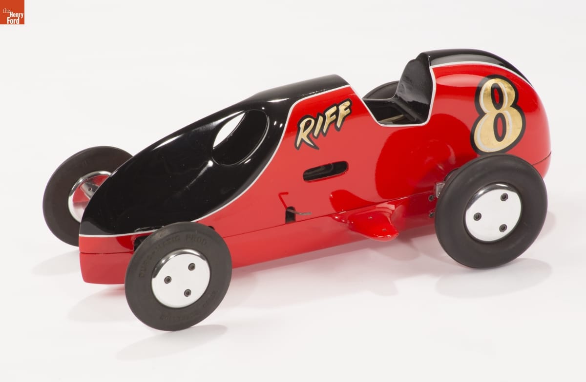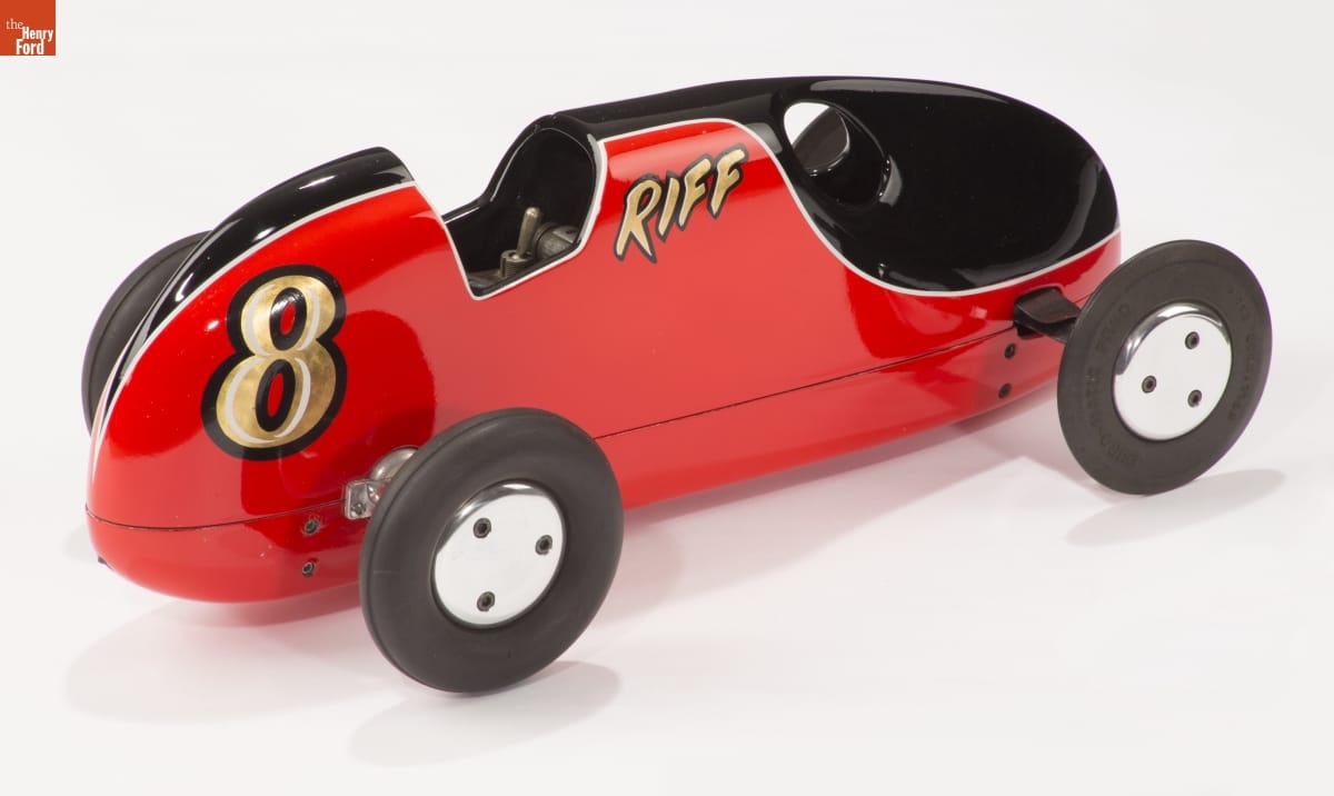 Tether cars, gas-powered model race cars, were popular in the 1930s and 1940s. They were raced individually while tethered to a central pivot, or against each other on a scaled-down board track. This car, with a magnesium top and belly pan, was one of a small batch built by George Riff of Chicago.