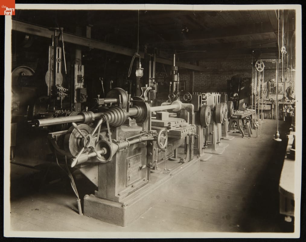 Inside the Armington & Sims Engine Company machine shop, a system of shafts and pulleys distributed mechanical energy to rows of metal working machine tools. The machinists who worked in shops like this could tackle a wide range of jobs. America's nineteenth century machine shops were a training ground for many technological innovators.