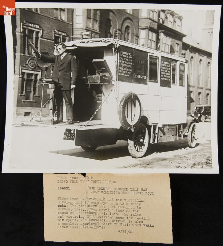 Fred L. Strickland Preaching from His Traveling Mission Truck, 1924
