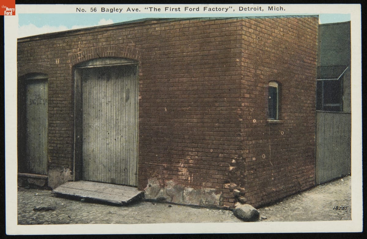 This shed sat behind a house at 58 Bagley Avenue in Detroit, Michigan, where Henry and Clara Ford lived for 3-1/2 years. Henry and friends built the Quadricycle, Ford's first automobile, in the shed in 1896. Many years later, Ford had the building reconstructed in Greenfield Village. Photographs of the original building and site helped ensure the replica's accuracy.