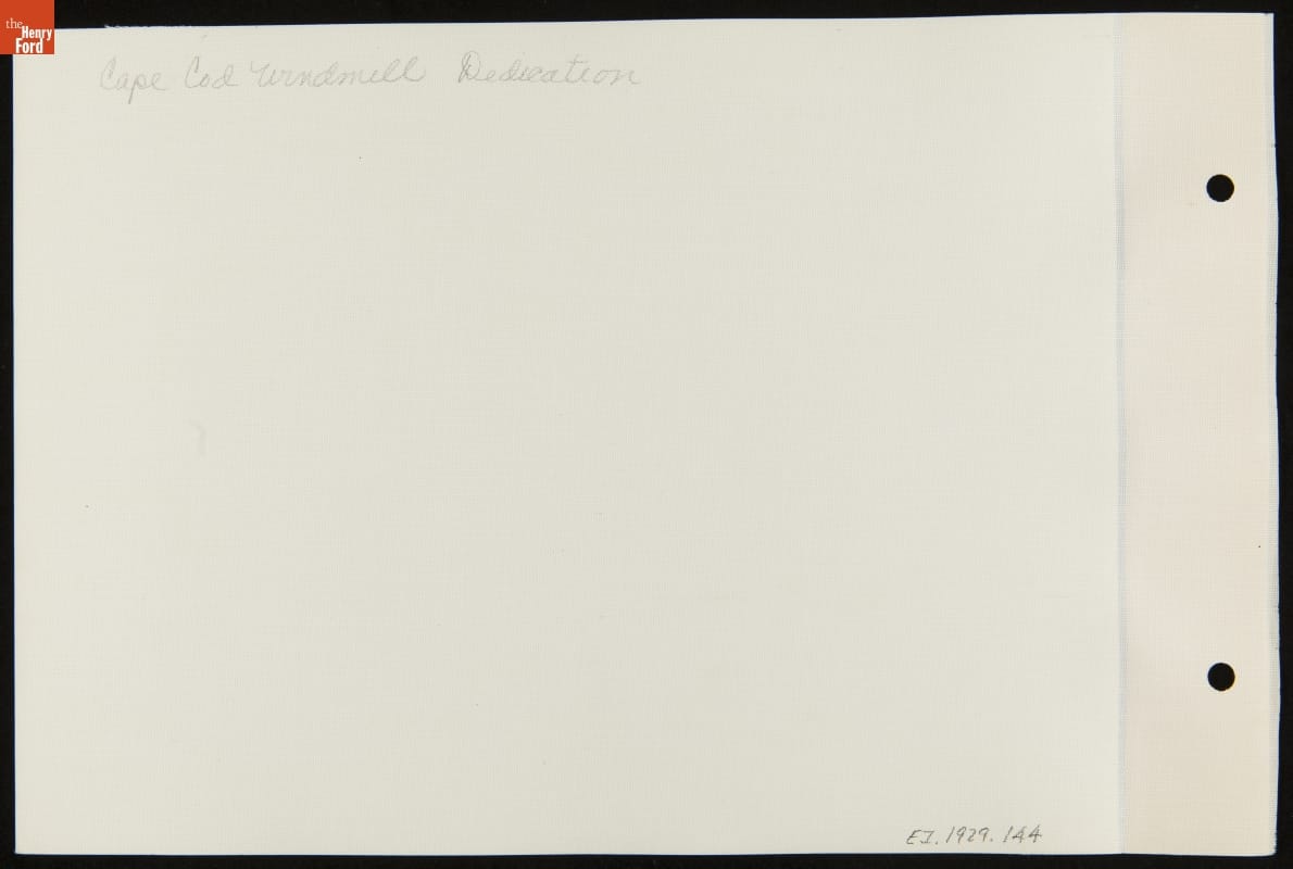 The Ford Dealers of the United States and Canada purchased the Farris windmill in 1935. The Cape Cod structure, built in the mid-1600s and said to be the oldest windmill in the United States, would be a gift to Henry Ford. The windmill was dismantled and reassembled in Ford's Greenfield Village. In November 1936, thousands of Ford dealers attended the official presentation ceremony.
