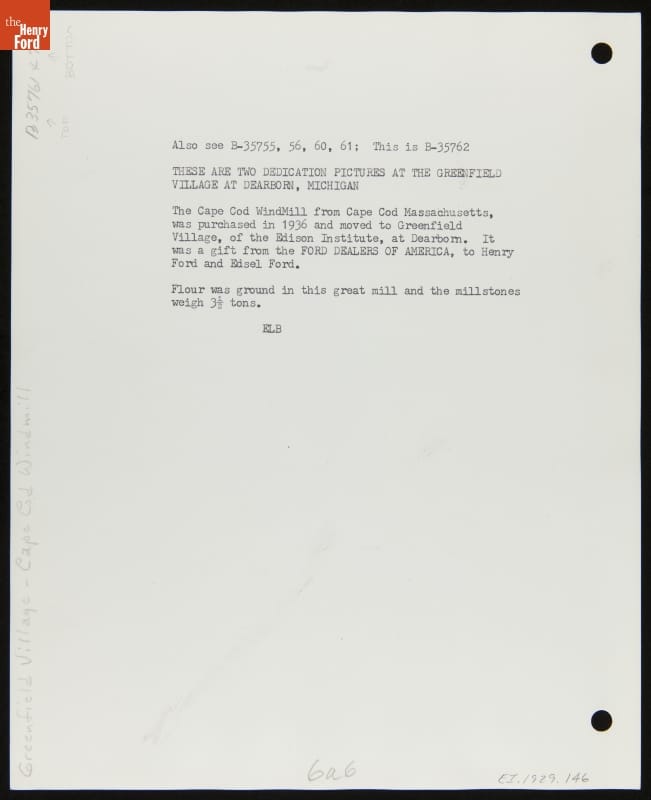 The Ford Dealers of the United States and Canada purchased the Farris windmill in 1935. The Cape Cod structure, built in the mid-1600s and said to be the oldest windmill in the United States, would be a gift to Henry Ford. The windmill was dismantled and reassembled in Ford's Greenfield Village. In November 1936, thousands of Ford dealers attended the official presentation ceremony.