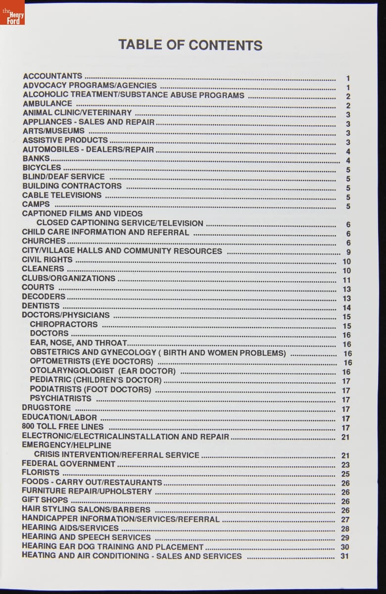 This directory was compiled to help people who are deaf or with speech disorders to connect to text-based telephone services. The businesses and services listed within--doctors, schools, churches, government offices--typically had their own teletypewriter terminal to exchange messages with TDD/TTY users. If a business didn't have their own equipment, a relay service could be used to facilitate communication.