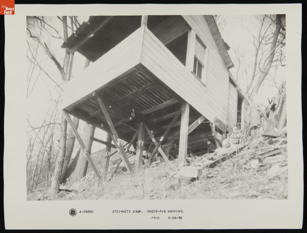 Marking the Supports of Charles Steinmetz Cabin before Dismantling for the Move to Greenfield Village, February 22, 1930