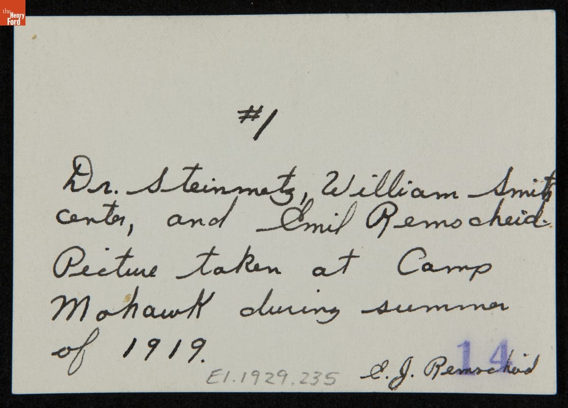 handwritten on back: #1 / Dr. Steinmetz, William Smith center, and Emil Remscheid. Picture taken at Camp Mohawk during summer of 1919. / E.J. Remscheid
