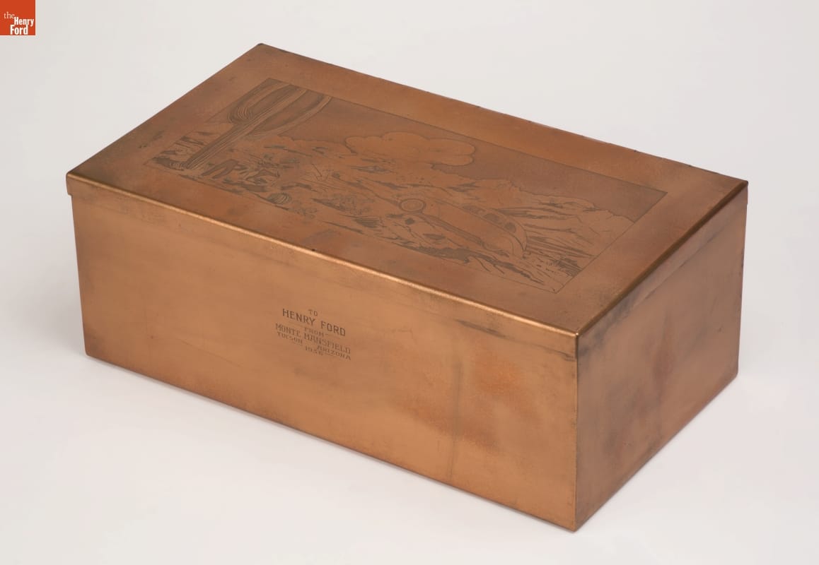 Henry Ford's corporate family was generous when it came to acknowledging their leader's enterprising and innovative strides forward. This copper box, with an elaborately worked Western scene on the lid, features a Ford automobile as the focal point. The donor established the first Ford dealership in Tucson, Arizona, beginning with the sale of Model Ts in 1914.