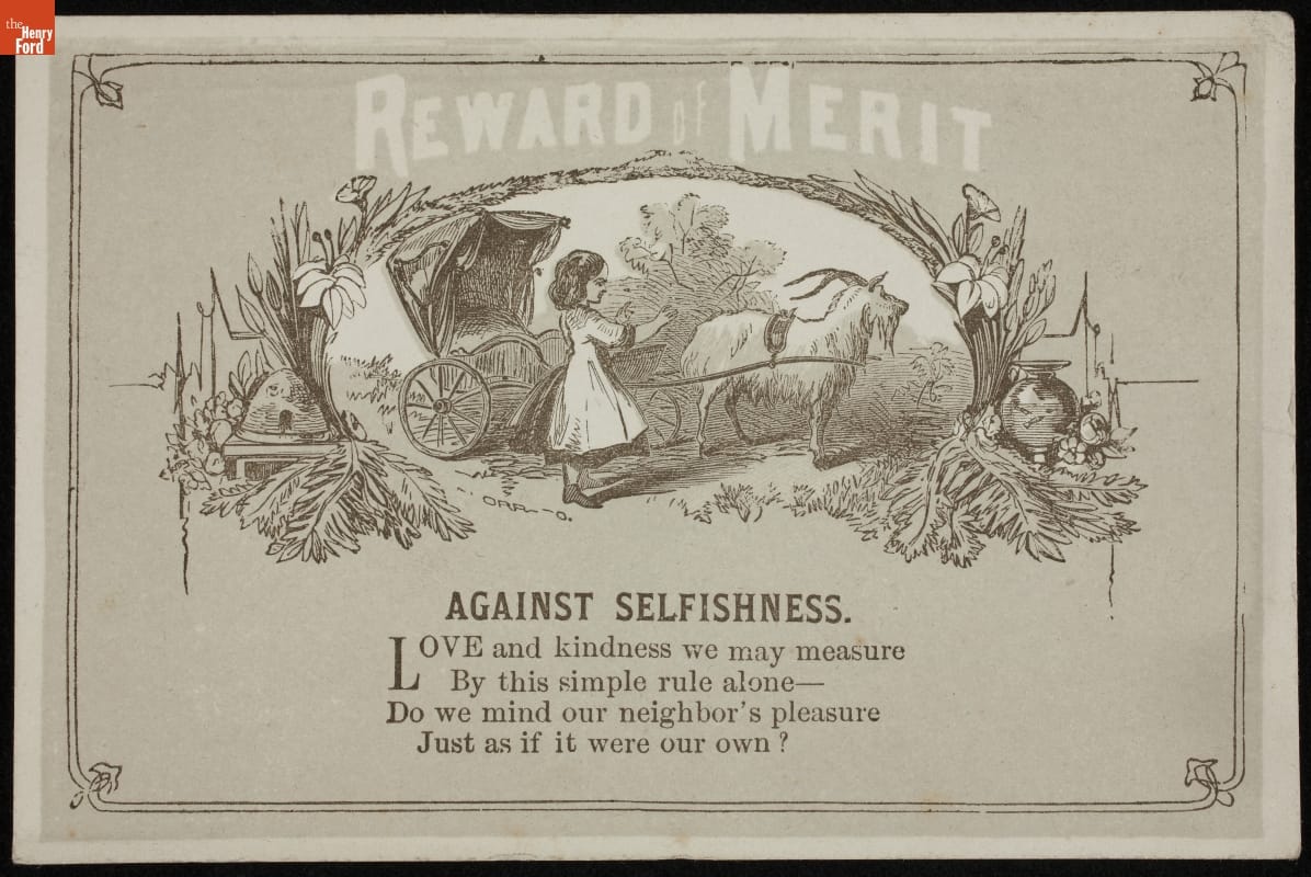 During the nineteenth-century, teachers recognized students with paper "rewards of merit." These small tokens commended a student's excellent work, perfect attendance, good behavior or other noteworthy accomplishment. Some contained simple handwritten sentiments from the teacher to the pupil. Many were printed and colorful, with space available to write in the student's name as well as their own.