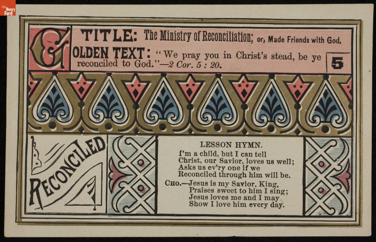 TITLE: The Ministry of Reconciliation; or, Made Friends with God. | GOLDEN TEXT: "We pray you in Christ's stead, be ye reconciled to God."--2 Cor. 5 : 20 [...] RECONCILED [...] LESSON HYMN [...]