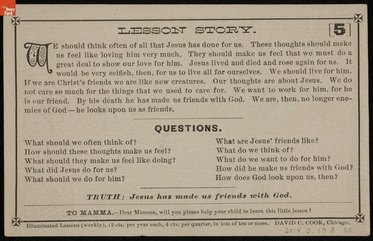 LESSON STORY. | [...] QUESTIONS | [...] TRUTH: Jesus has made us friends with God. | [...] Illuminated Lessons (weekly), 12 cts. per year each, 4 cts. per quarter, in lots of ten or more. DAVID C. COOK, Chicago.