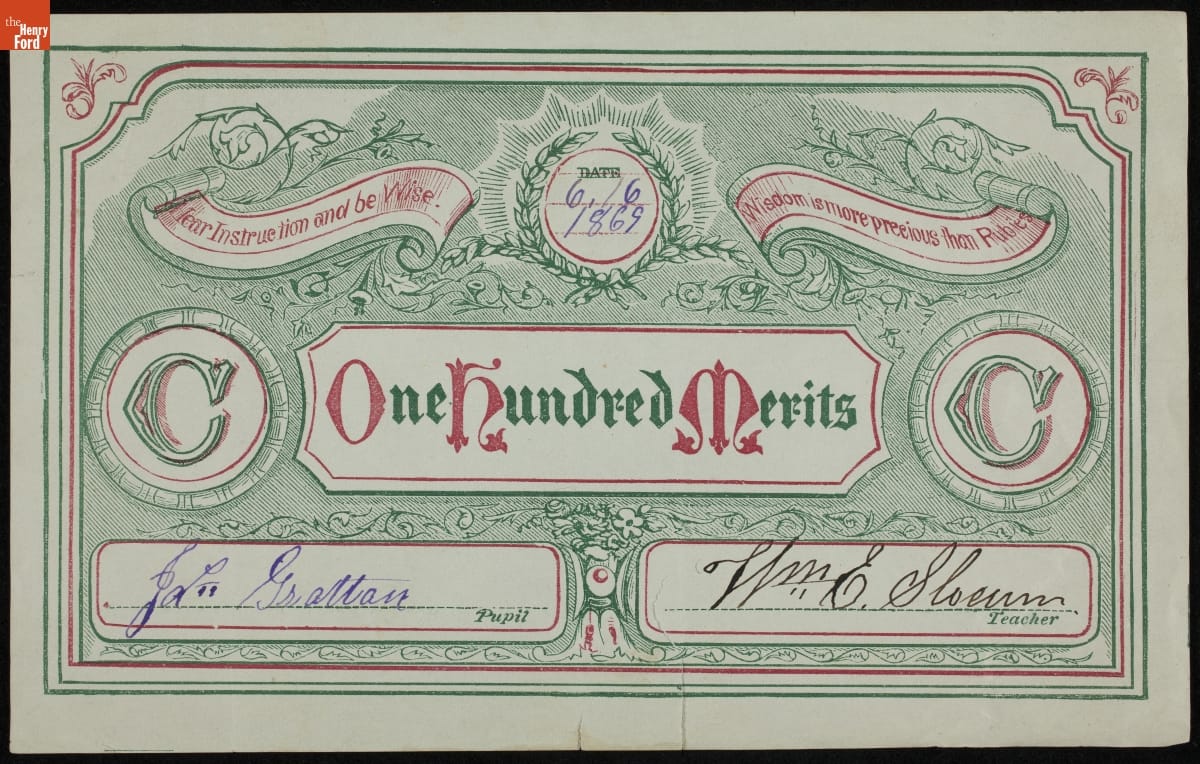 During the nineteenth-century, teachers recognized students with paper "rewards of merit." These small tokens commended a student's excellent work, perfect attendance, good behavior or other noteworthy accomplishment. Some contained simple handwritten sentiments from the teacher to the pupil. Many were printed and colorful, with space available to write in the student's name as well as their own.