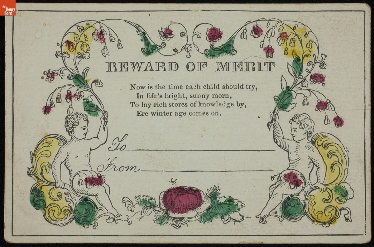 During the nineteenth-century, teachers recognized students with paper "rewards of merit." These small tokens commended a student's excellent work, perfect attendance, good behavior or other noteworthy accomplishment. Some contained simple handwritten sentiments from the teacher to the pupil. Many were printed and colorful, with space available to write in the student's name as well as their own.