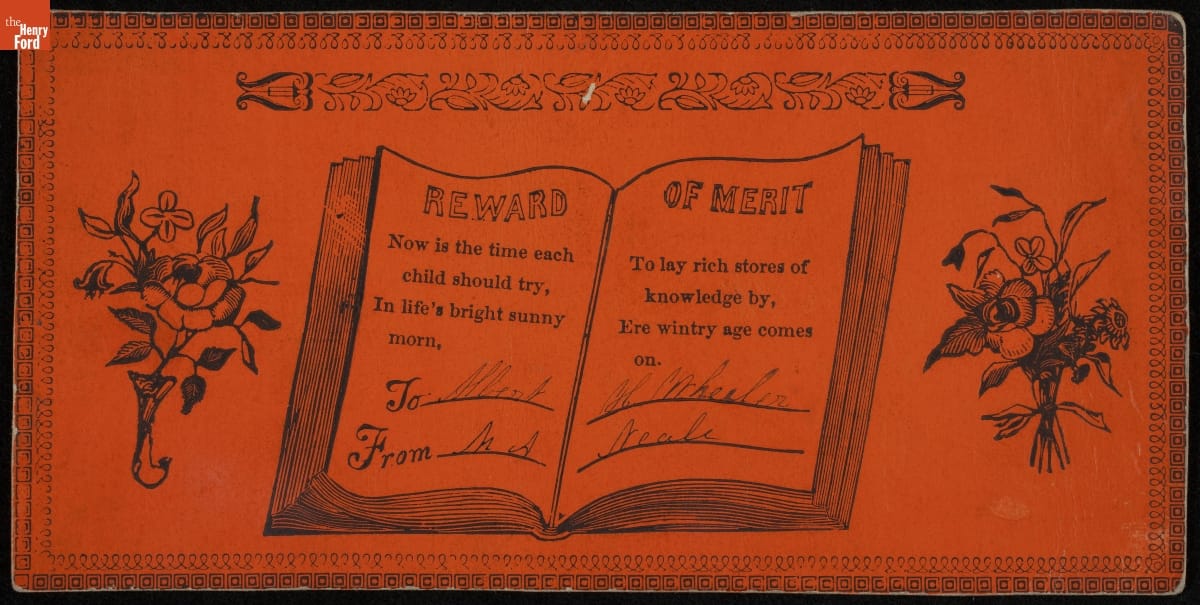 During the nineteenth-century, teachers recognized students with paper "rewards of merit." These small tokens commended a student's excellent work, perfect attendance, good behavior or other noteworthy accomplishment. Some contained simple handwritten sentiments from the teacher to the pupil. Many were printed and colorful, with space available to write in the student's name as well as their own.