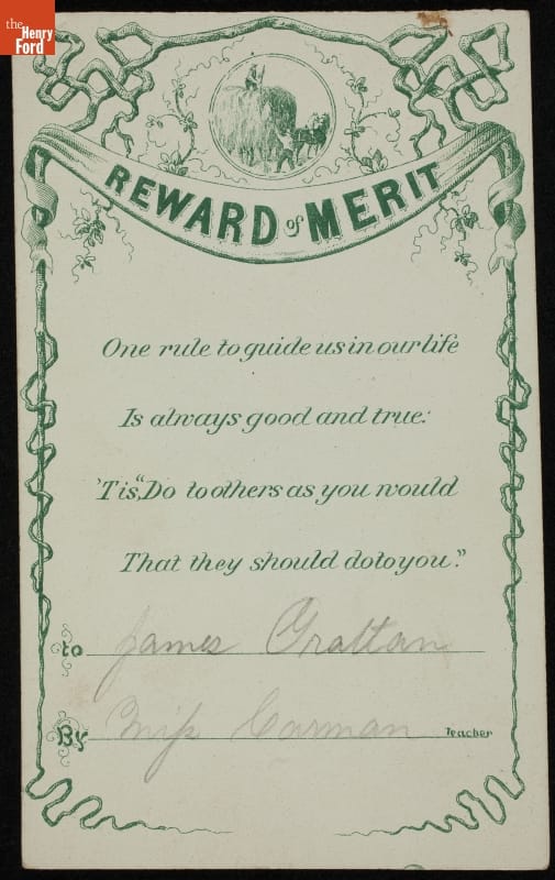 During the nineteenth-century, teachers recognized students with paper "rewards of merit." These small tokens commended a student's excellent work, perfect attendance, good behavior or other noteworthy accomplishment. Some contained simple handwritten sentiments from the teacher to the pupil. Many were printed and colorful, with space available to write in the student's name as well as their own.
