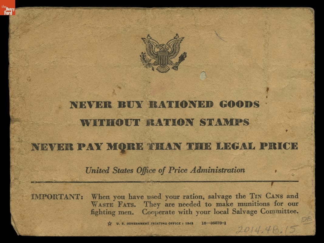 NEVER BUY RATIONED GOODS/ WITHOUT RATION STAMPS/ NEVER PAY MORE THAN THE LEGAL PRICE/ United States Office of Price Administration/ IMPORTANT"/ When you have used you ration, salvage the TIN CANS and/ WASTE FATS. They are needed to make munitions for our/ fighting men. Cooperate with your local Salvage Committee./...
