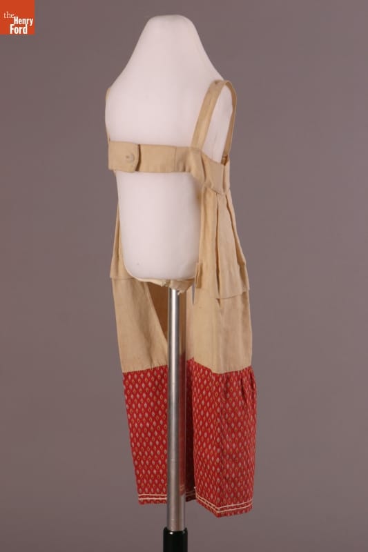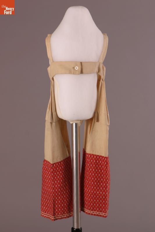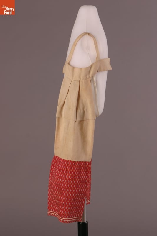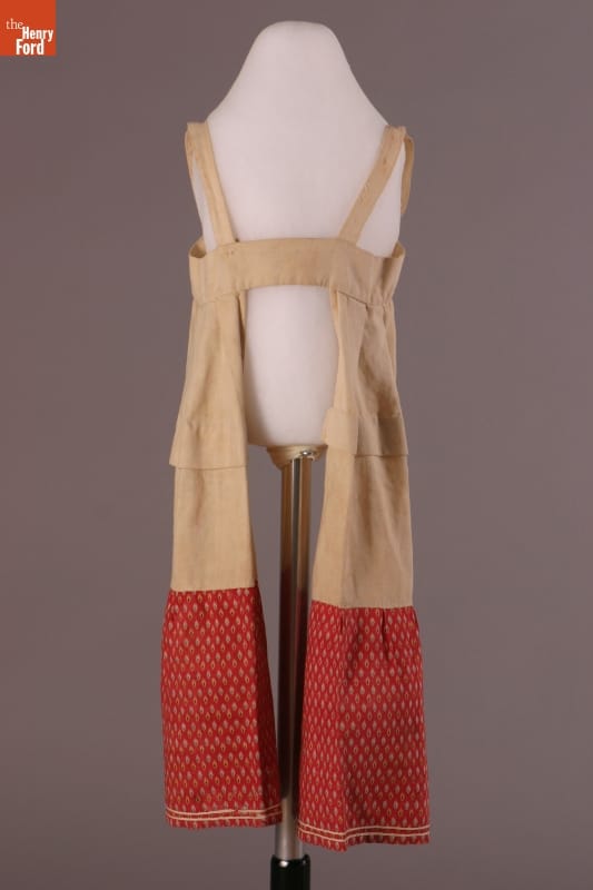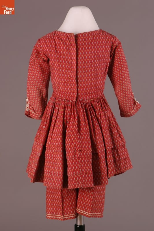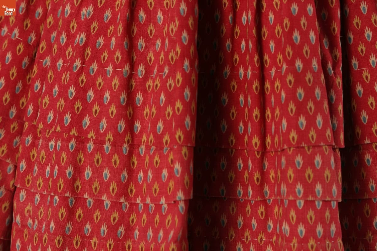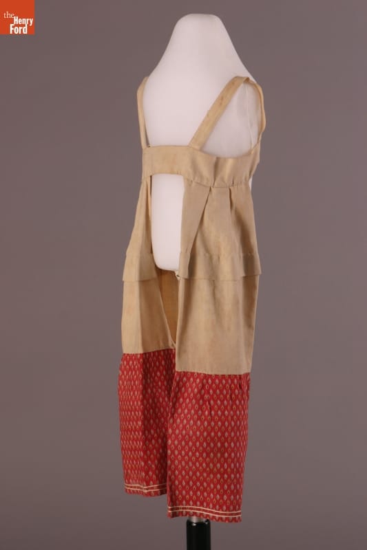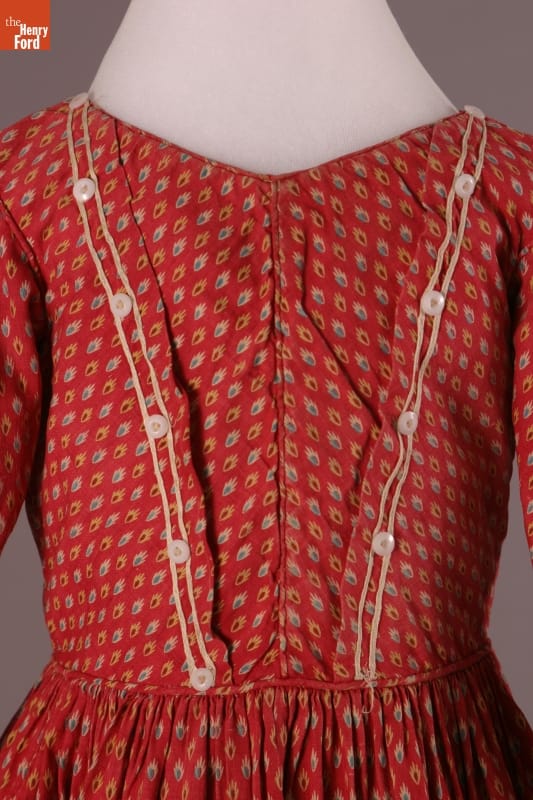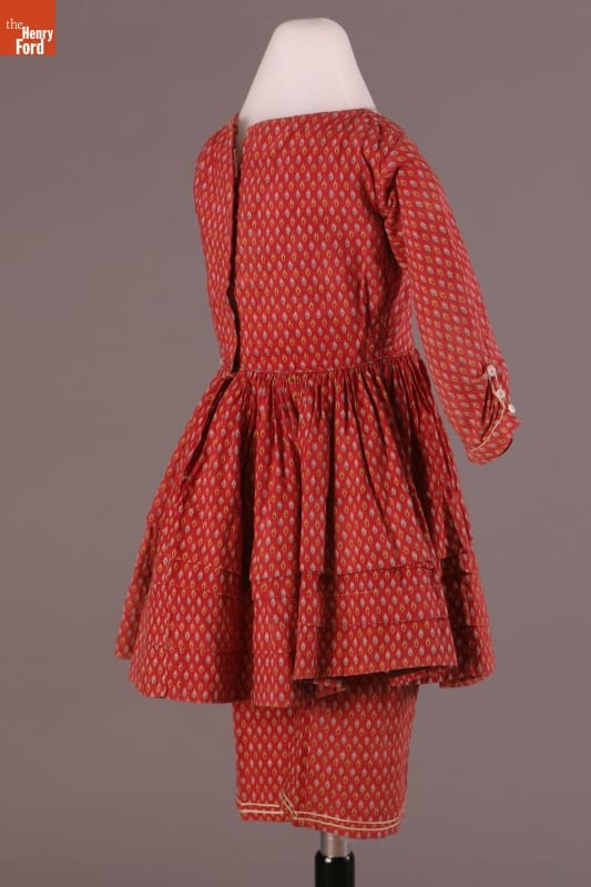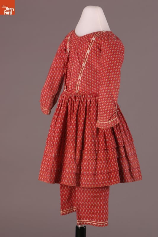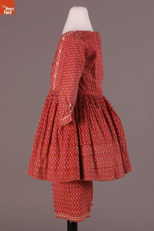 The short hem of this dress and the pantalettes beneath allowed the young girl who wore them freedom of movement. This dress and pantalettes are homemade, pieced from scraps of cotton fabric. Cotton prints like these were often used for everyday garments -- they were inexpensive and the patterned fabrics helped hide dirt between washings.