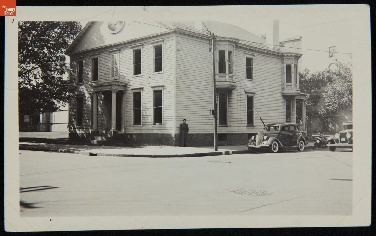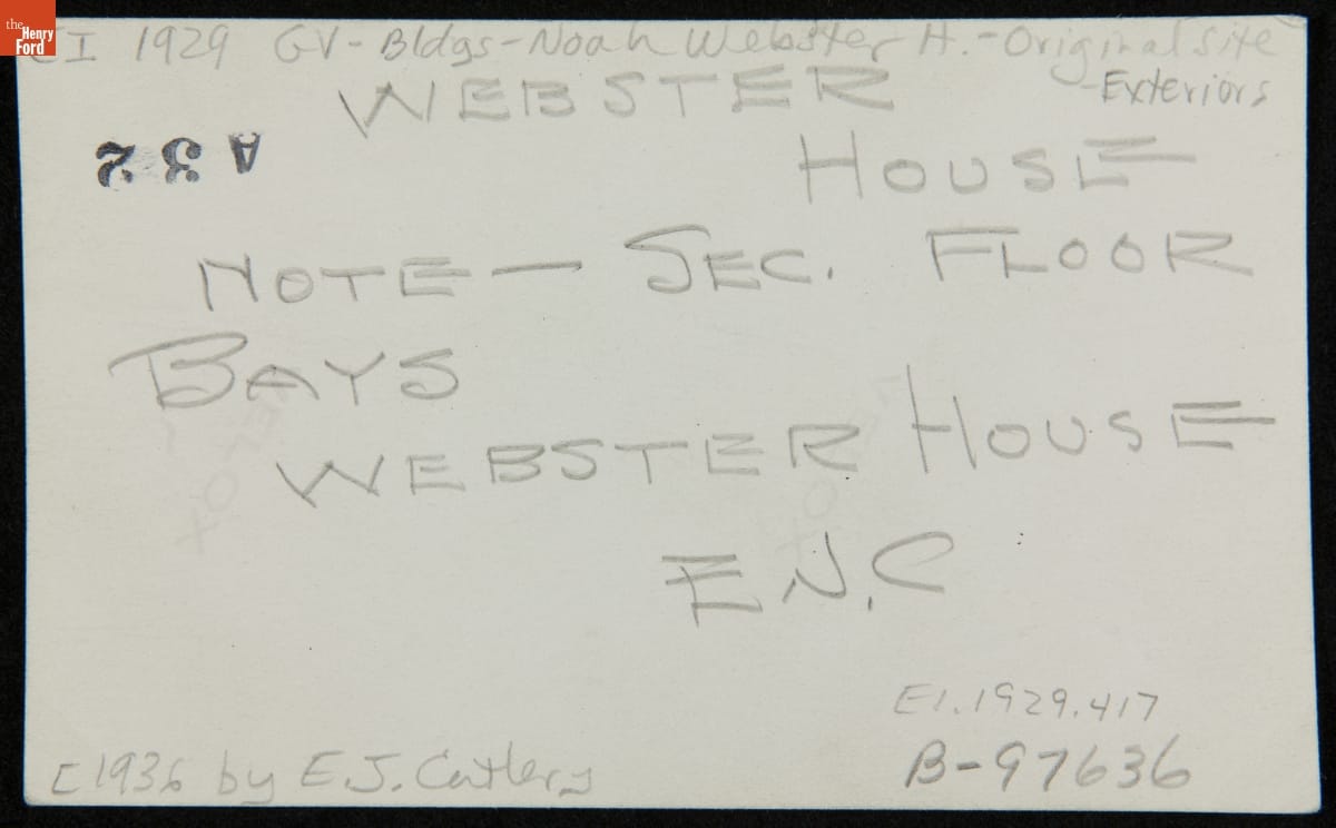 This is textbook pioneer and spelling reformer Noah Webster's home on its original site in New Haven, Connecticut. Henry Ford admired Webster and recognized his house as an important piece of American history. Ford had the building moved to Greenfield Village - his historical outdoor museum in Dearborn, Michigan. This view documents architectural details, including second floor bay windows not moved with the house.