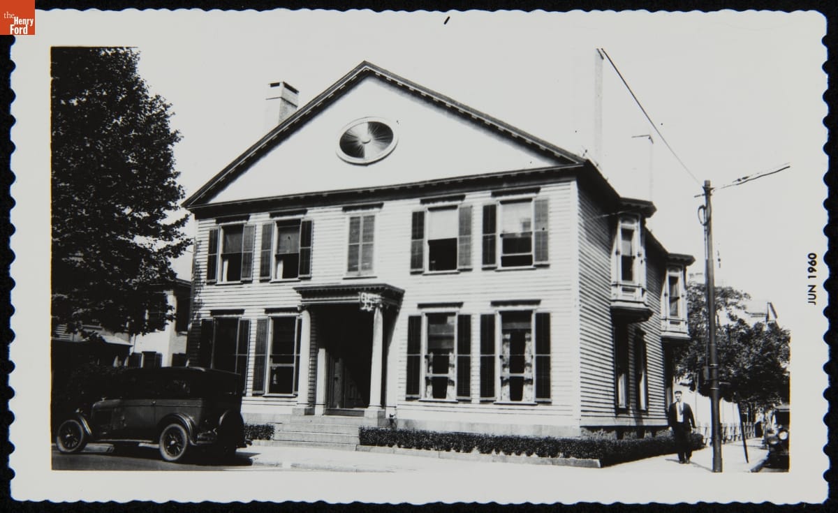 This is textbook pioneer and spelling reformer Noah Webster's home on its original site in New Haven, Connecticut. Henry Ford admired Webster and recognized his house as an important piece of American history. Ford had the building moved to Greenfield Village - his historical outdoor museum in Dearborn, Michigan. This view documents architectural details, including second floor bay windows not moved with the house.