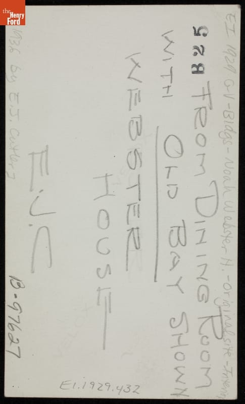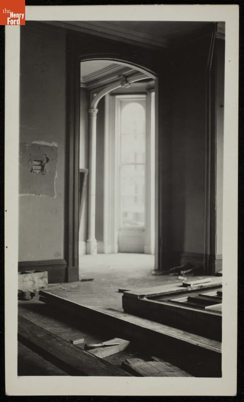 This is an interior view of textbook pioneer and spelling reformer Noah Webster's home on its original site in New Haven, Connecticut. Henry Ford admired Webster and recognized his house as an important piece of American history. Ford had the building moved to Greenfield Village - his historical outdoor museum in Dearborn, Michigan. This image documents interior details shortly before the move to Greenfield Village.