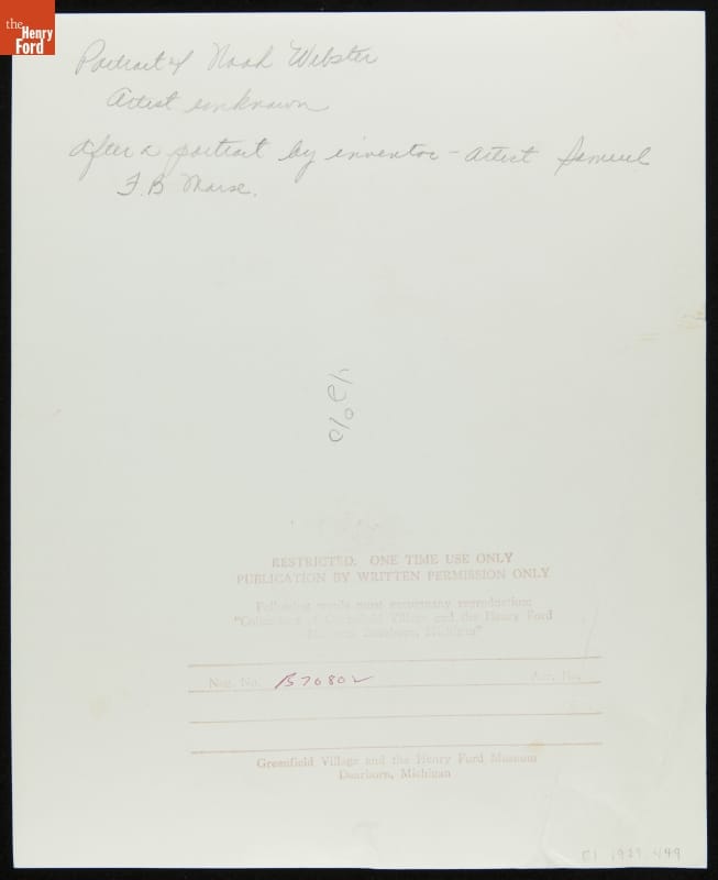 Portrait of Noah Webster, 1823, after a Painting by Samuel F.B. Morse, Photographed in Henry Ford Museum, January 1964