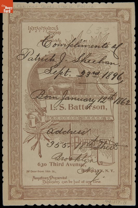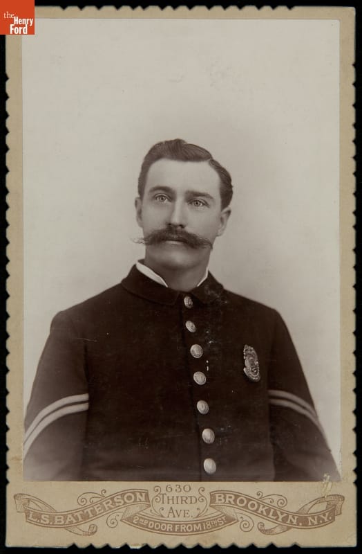 Growing American urban centers spurred the creation of modern police departments in the mid-1800s. By the end of the century, most police officers wore military-type uniforms and badges to help citizens easily identify them. This cabinet card shows Patrick Sheehan decked out in his uniform. Friends and family usually exchanged cabinet cards, sometimes adding a personal greeting on the back.