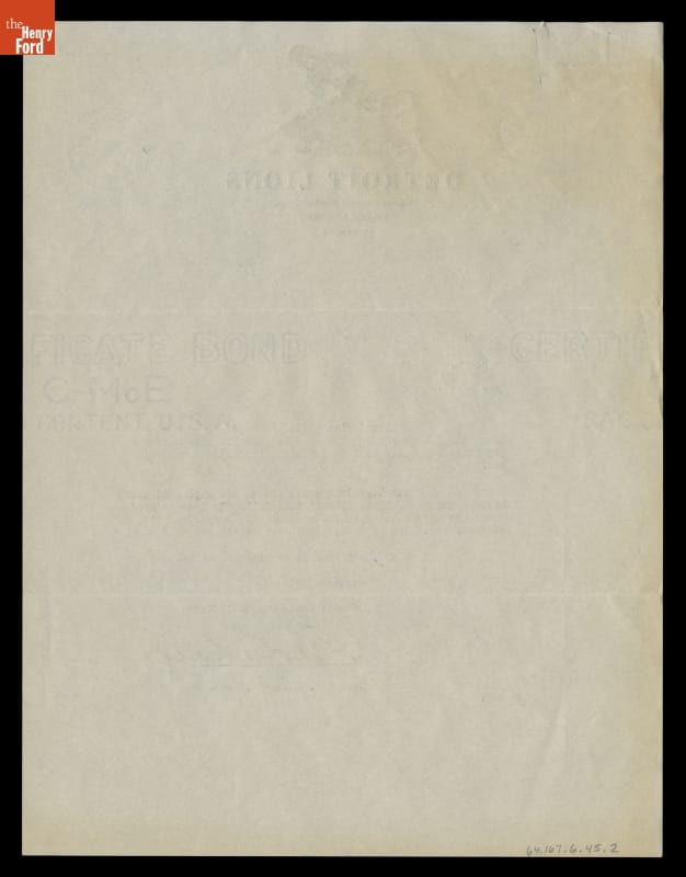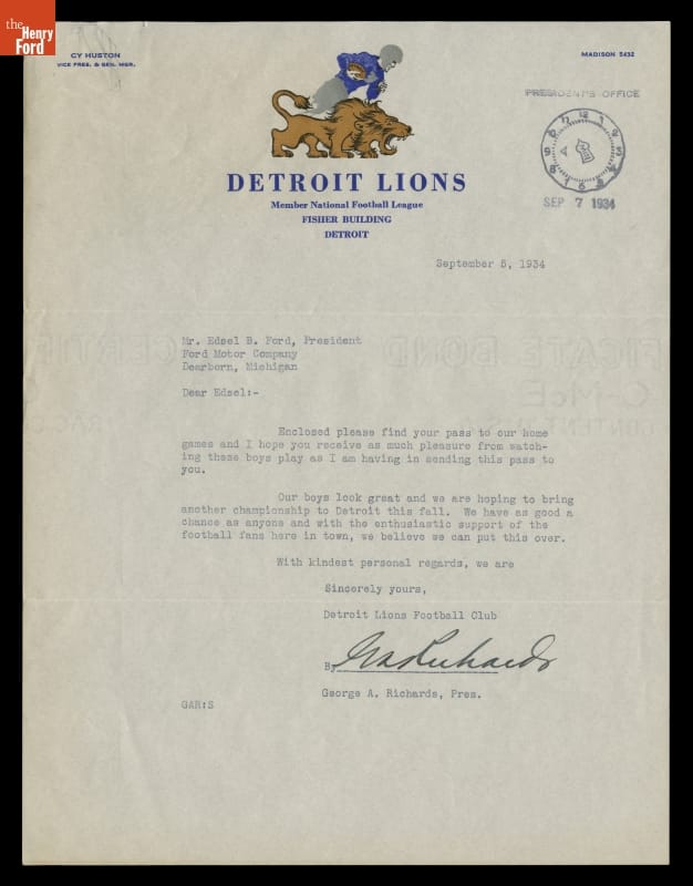 George Richards sent Edsel Ford a 1934 Detroit Lions football team season pass -- good for a reserved seat at their home games. Richards had just purchased and moved the Portsmouth, Ohio, football team (then called the Spartans) to Detroit. When the pass was cancelled due to federal tax regulations, Richards mailed Ford passes that could be exchanged for tickets to the remaining games.