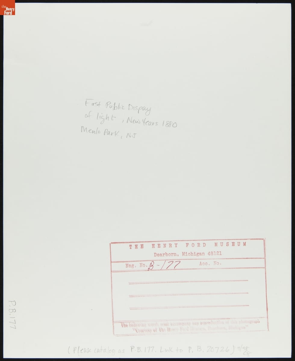 First Public Demonstration of Incandescent Lighting by Thomas A. Edison, 1879"