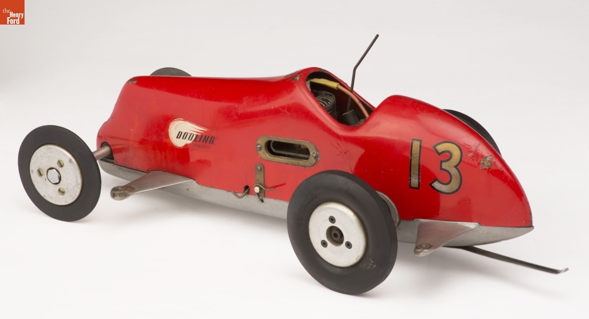 Tether cars, gas-powered model race cars, were popular in the 1930s and 1940s. They were raced individually while tethered to a central pivot, or against each other on a scaled-down board track. Dooling Brothers, of Los Angeles, California, manufactured a complete line of open-cockpit and streamliner models. Company owners Tom, Harris and Russell Dooling were successful tether car racers themselves.