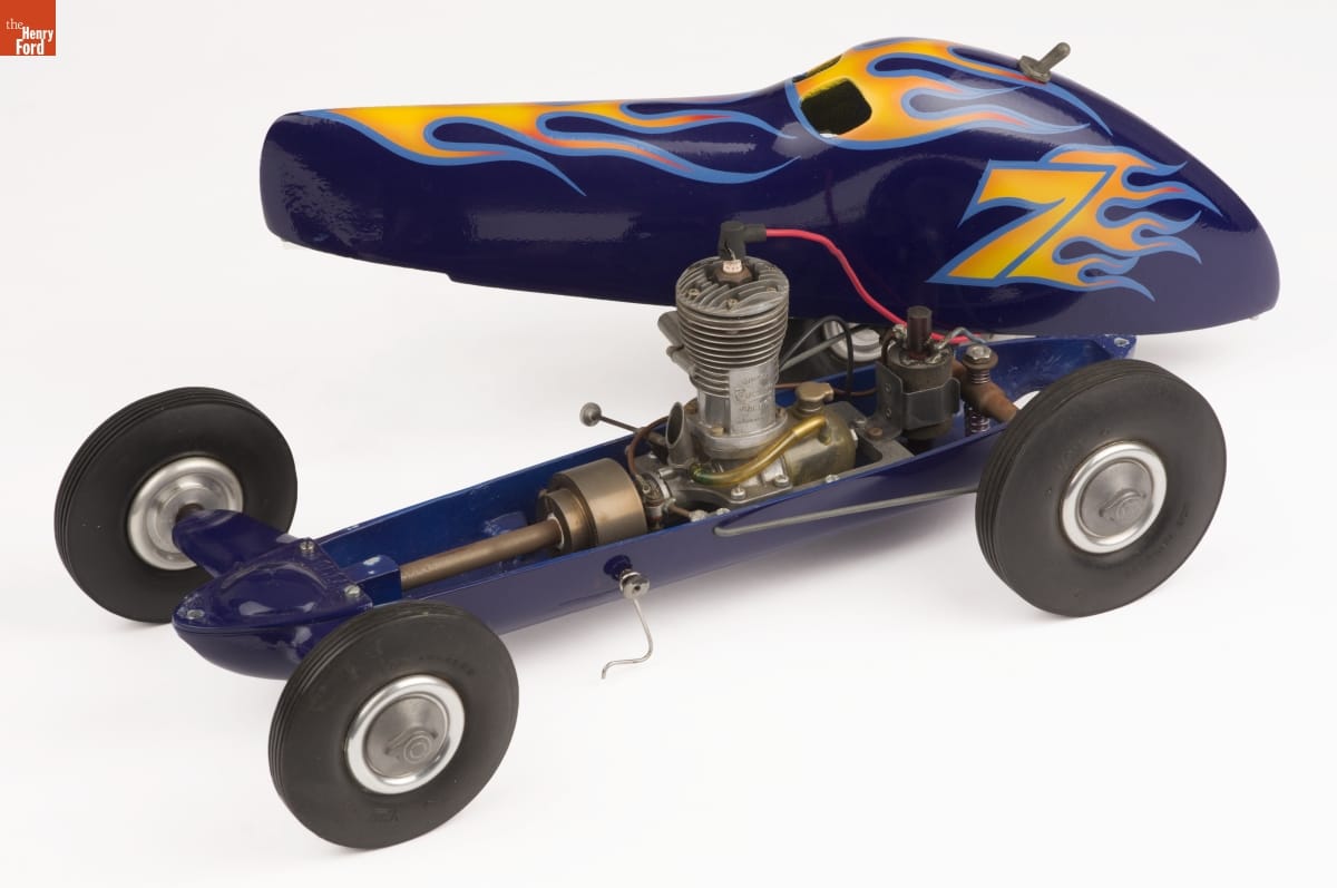 Tether cars, gas-powered model race cars, were popular in the 1930s and 1940s. They were raced individually while tethered to a central pivot, or against each other on a scaled-down board track. New York-based Airflow Industries advertised its "Defender" cars as the only ones "aerodynamically streamlined and wind-tunnel tested." This design process, the company boasted, was the secret to greater speed.