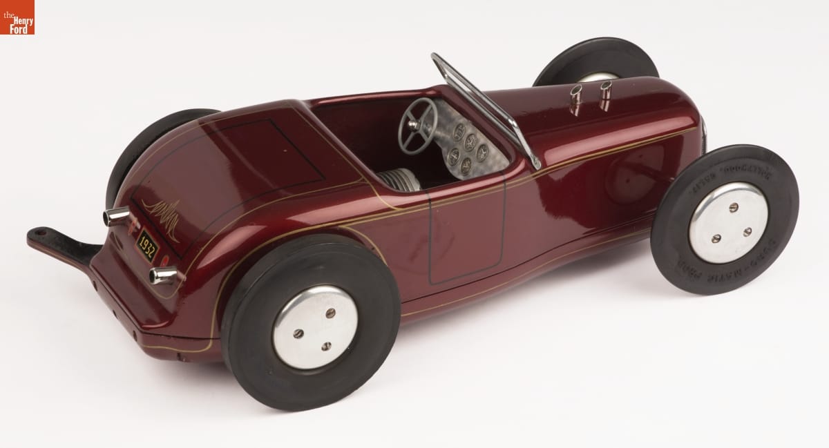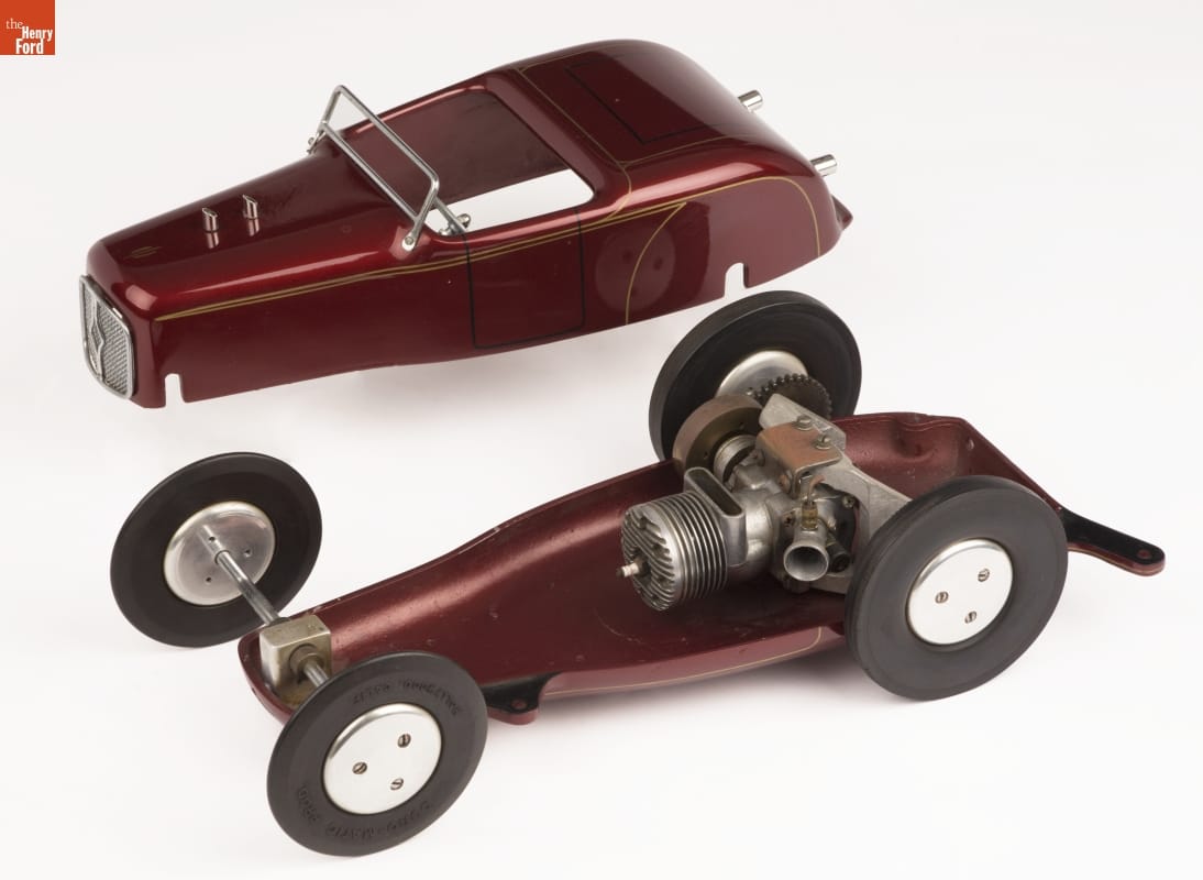 Tether cars, gas-powered model race cars, were popular in the 1930s and 1940s. They were raced individually while tethered to a central pivot, or against each other on a scaled-down board track. While many tether cars were based on contemporary race cars, this "Roadrunner" was modeled after a 1932 Ford hot rod. Details included faux carburetor velocity stacks in the hood.