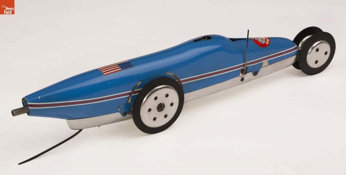 Tether cars, gas-powered model race cars, were popular in the 1930s and 1940s. They were raced individually while tethered to a central pivot, or against each other on a scaled-down board track. The models found new appreciation in the 1980s and 1990s. Garold Frymire built some 320 streamliners. The exhaust pipe on this one is tuned in length for maximum performance.